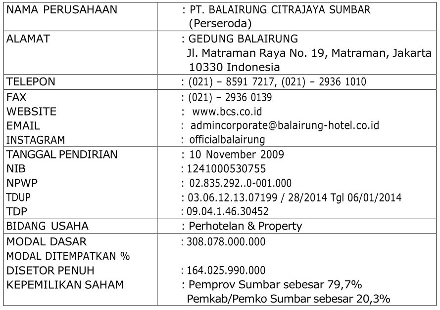 a. 10 November 2009, PT Balairung Citrajaya Sumbar Berdiri Proses berdirinya perusahaan ditandai dengan diakta-kannya pendirian perusahaan pada tanggal 10 November 2009 pada Notaris Catur Virgo, SH dengan dasar hukum Peraturan Daerah Pemerintah Daerah Provinsi Sumatera Barat.
